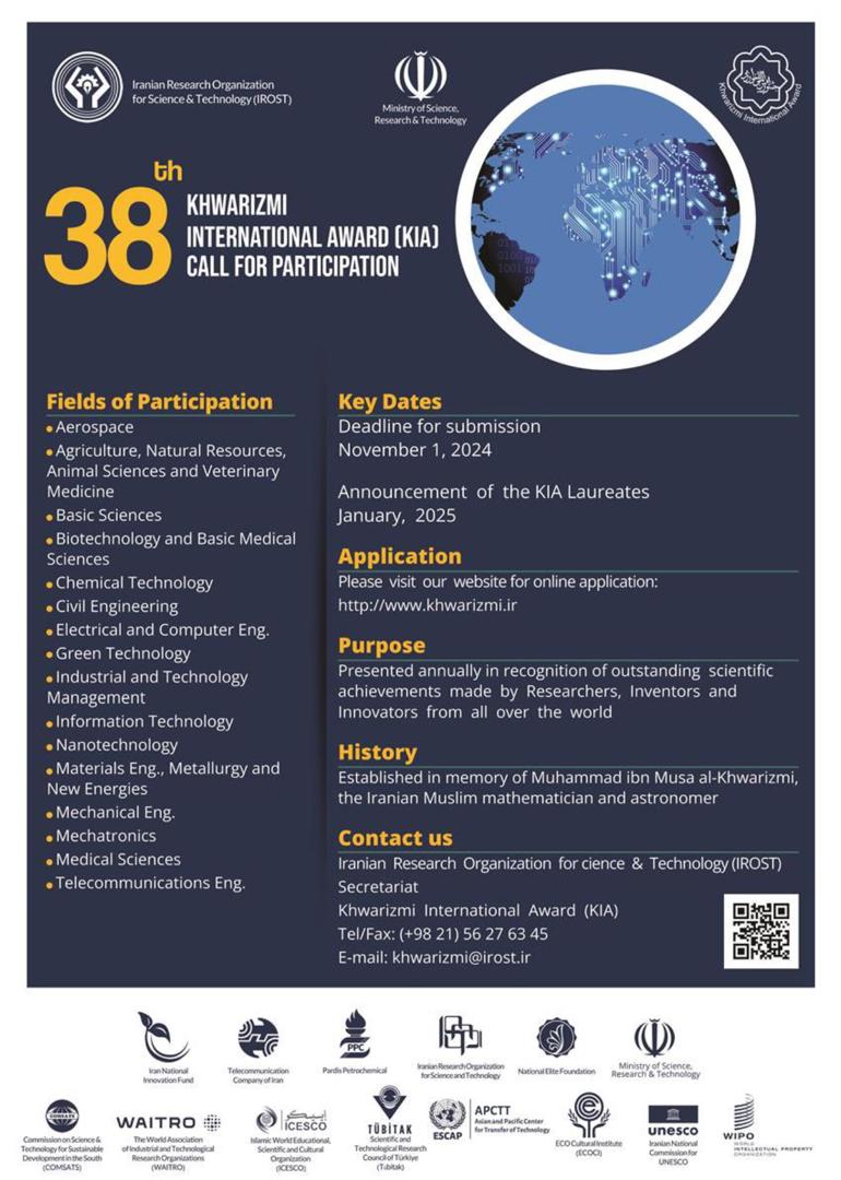 La date limite d'inscription électronique et de soumission des projets au secrétariat du festival est fixée au 1er novembre 2024. Pour plus d'informations sur les domaines scientifiques acceptés, les spécialisations connexes, ainsi que les conditions et modalités d'inscription, veuillez consulter le guide de participation au festival sur le portail des festivals Khwarizmi à l'adresse suivante : http://khwarizmi.ir/