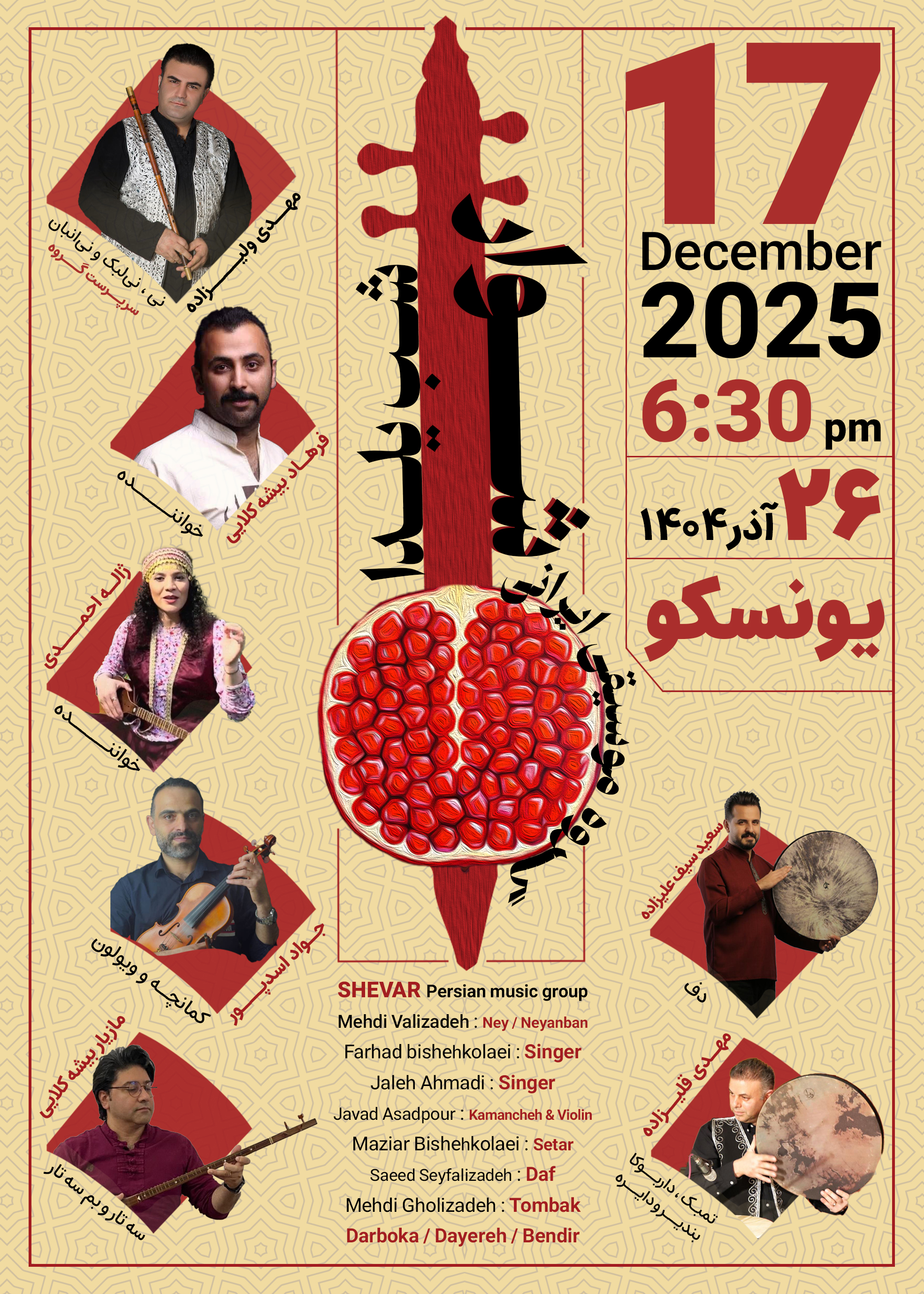 ضمن تبریک به مناسبت فرا رسیدن شب یلدا، به اطلاع هموطنان عزیز می رساند به منظور گرامیداشت این سنت باستانی برنامه موسیقی سنتی توسط گروه شوار مورخ 26 آذرماه 1404 در یکی از سالنهای دفتر یونسکو در پاریس برگزار میشود.